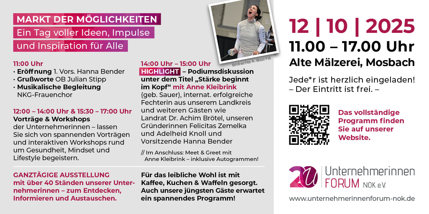 Seit zwei Jahrzehnten steht das Unternehmerinnenforum für gelebtes Netzwerken, gegenseitige Unterstützung, gemeinsames Wachstum und die Sichtbarkeit selbstständiger Frauen in unserer Region. Dieses besondere Jubiläum möchten wir gemeinsam mit Ihnen feiern!