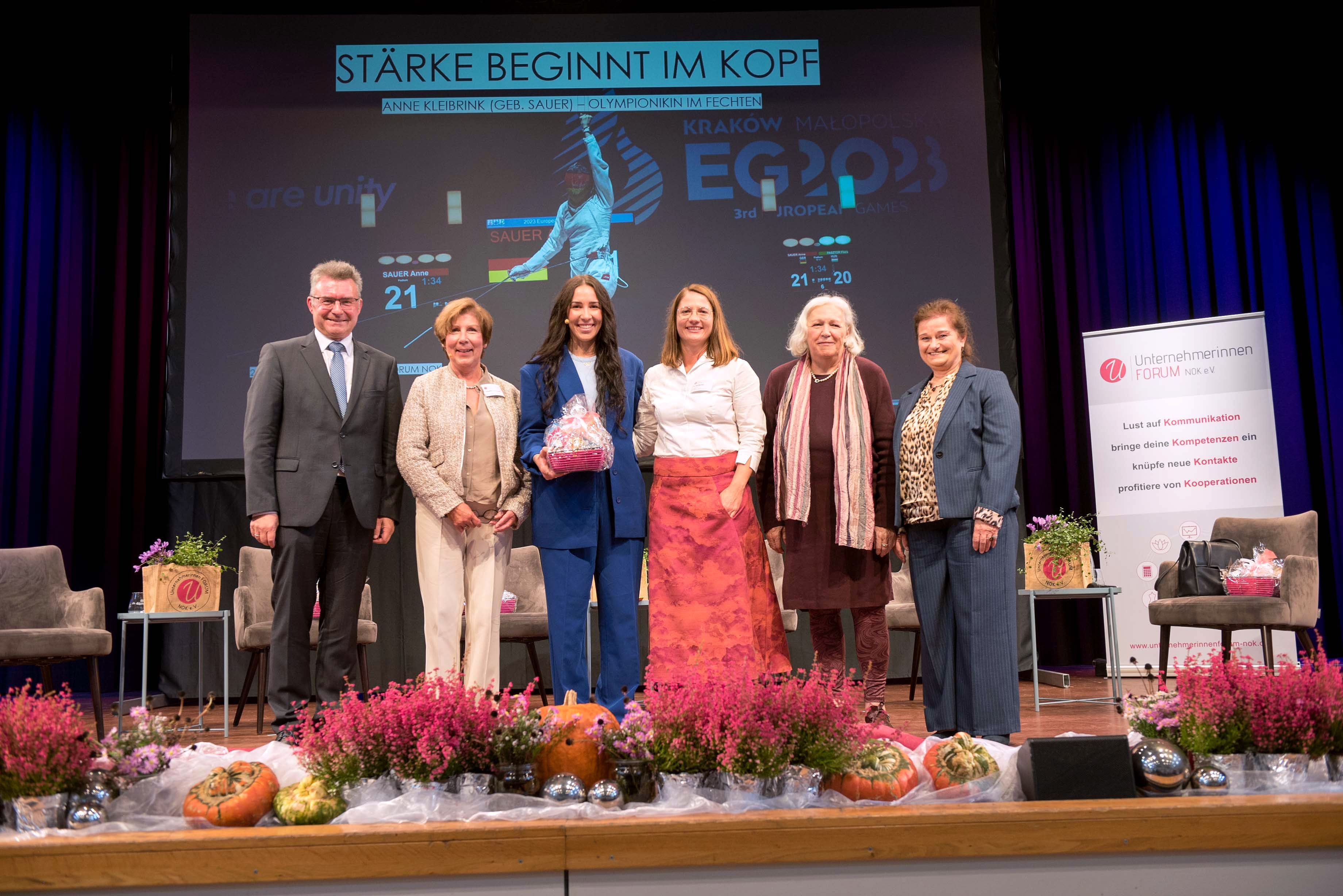 Als weiteres Highlight des Tages konnte die aktuelle und mehrfache Deutsche Meisterin im Damenflorett Anne Kleibrink gewonnen werden. Sie sprach über ihren Weg im Leistungssport mit seinen vielfältigen Herausforderungen und die Bedeutung von mentaler Stärke und Konzentration. Diese Fähigkeiten lassen sich auch auf das Unternehmertum übertragen. Die Podiumsdiskussion, an der neben Anne Kleibrink auch die Gründungsmitglieder Felicitas Zemelka und Adelheid Knoll sowie Landrat Dr. Achim Brötel und Hanna Bender teilnahmen trug deshalb auch den Titel „Stärke beginnt im Kopf!“