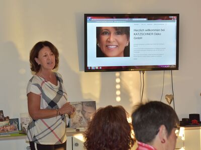 Mit Melanie Meder, Inhaberin von Katzschner Deko mit Sitz in Bad Mergentheim lernten wir einen weiteren Betrieb kennen. Katzschner Deko ist eine Firma mit langer Tradition seit 1931. Frau Meder ist 1986 als Sachbearbeiterin in die Firma gekommen. Im Jahr 2012 hat sie dann die Geschäftsführung übernommen. Katzschner Deko stellt meist in Heimarbeit Dekorationsprodukte her. Kleine Blätter, Blüten, Engelchen, Osterhäschen, welche überwiegend die gängigen im Handel zu findenden Süßwaren verzieren. Mitbringsel + Deckchen, Täschchen aus Filz runden die Produktpalette ab.