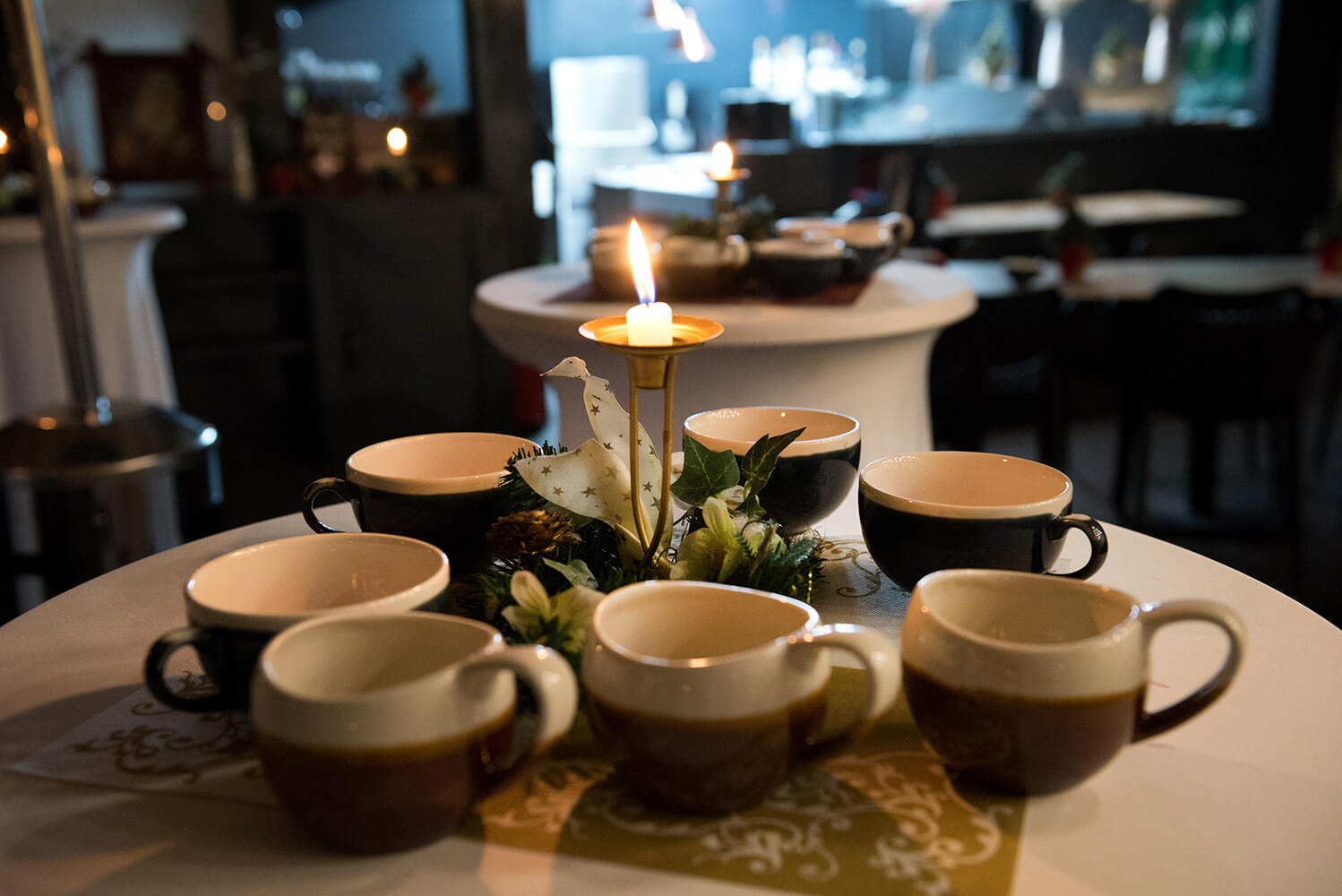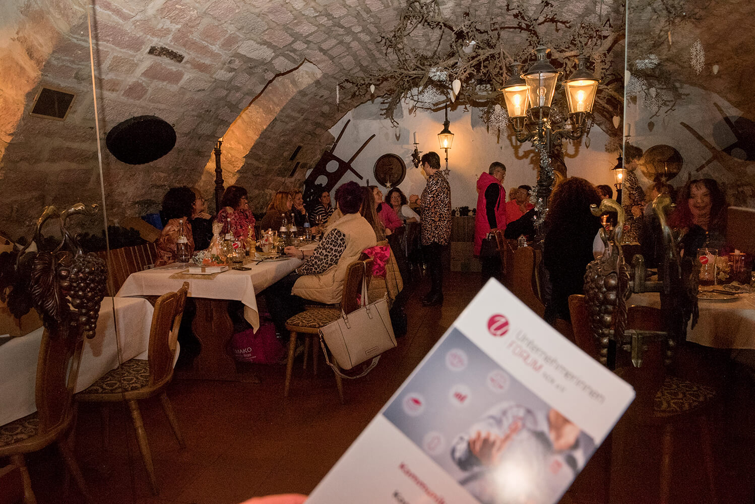 Danach setzten wir uns in den herrlich geschmückten Gewölbekeller und genossen die kulinarischen Köstlichkeiten. Carolin Blas hatte für jede ein Geschenktütchen liebevoll verpackt und damit den Platz dekoriert.